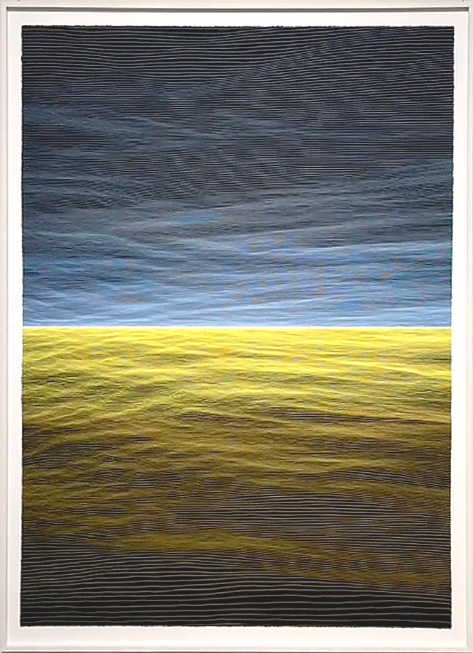 „Zwischen den Linien“ ist bei Ann Aspinwall Programm ihres künstlerischen Schaffens. Zwischen den Linien entstehen neue Räume, eben Zwischenräume, die nur durch die benachbarten Elemente existieren können. Der Titel geht auch auf die englische Redewendung „Read between the lines“ zurück, hierbei geht es um eine verborgene Bedeutung in einem Text oder einer Aussage, die über das hinausgeht, was explizit geschrieben oder gesprochen wird, also durch Interpretation entsteht. Die Bildmotive sowie die Farbgebung der großformatigen Druckgrafiken von Ann Aspinwall sind durch Landschaftseindrücke gekennzeichnet und entwickeln eine scheinbare Bewegung, im Wechselspiel der verwendeten Farben entwickelt sich eine eigenständige Dynamik.