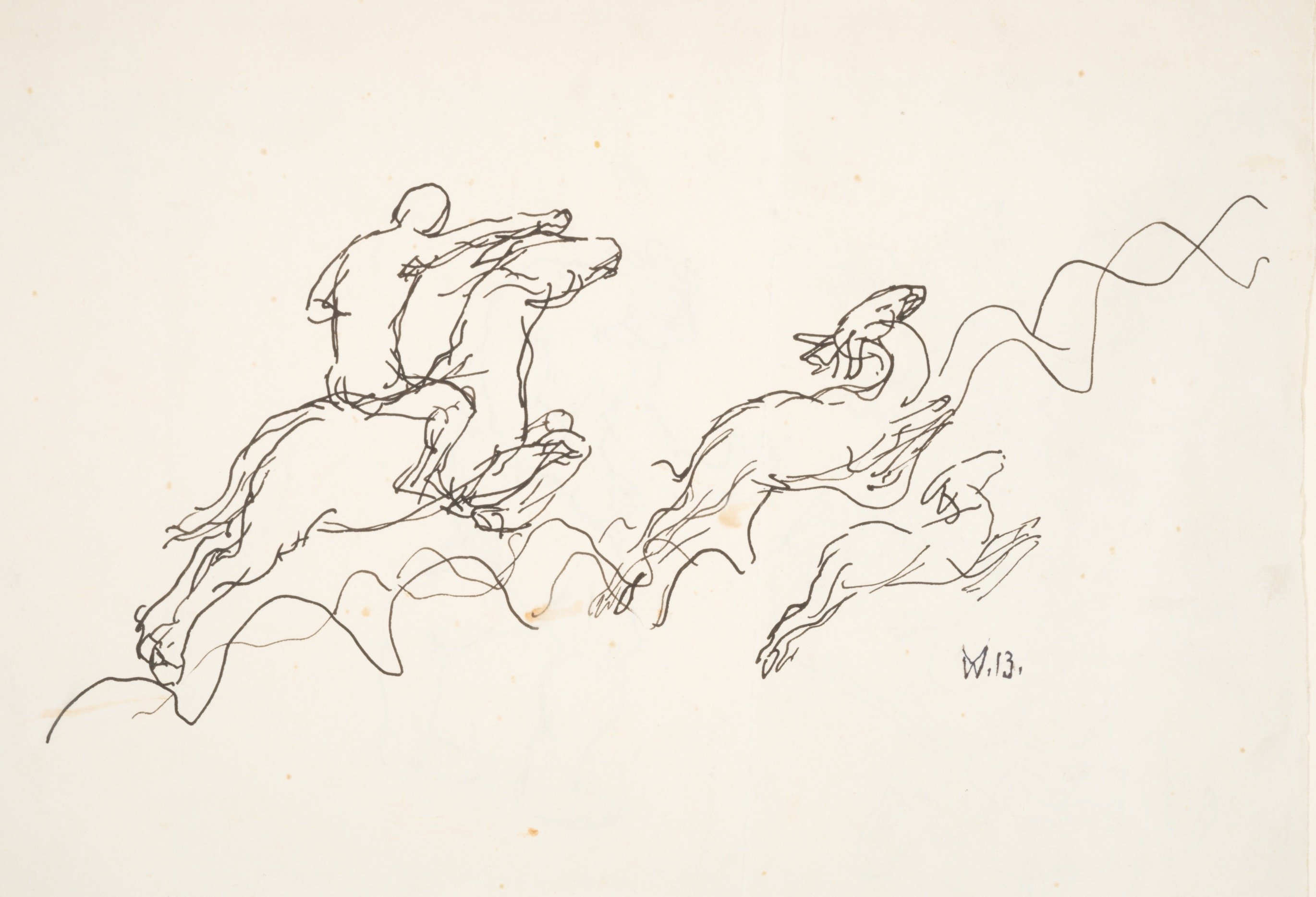 Der Förderverein des Museum Wilhelm Morgner e. V. hat die Zeichnung “Jagd” von Wilhelm Morgner als großzügiges Geschenk erhalten. Die Federzeichnung stammt aus dem Jahr 1913 und ist ca. 23 × 30 cm groß. Auf der Rückseite der Zeichnung befindet sich eine Federskizze sowie der Nachlassstempel mit der handschriftlich angebrachten roten Nummer “1046”, die Georg Tappert, der Lehrer und Mentor von Wilhelm Morgner, 1920 bei der Inventarisierung der Morgner Arbeiten vergeben hat. Die Betitelung der Zeichnung stammt auch von Georg Tappert.